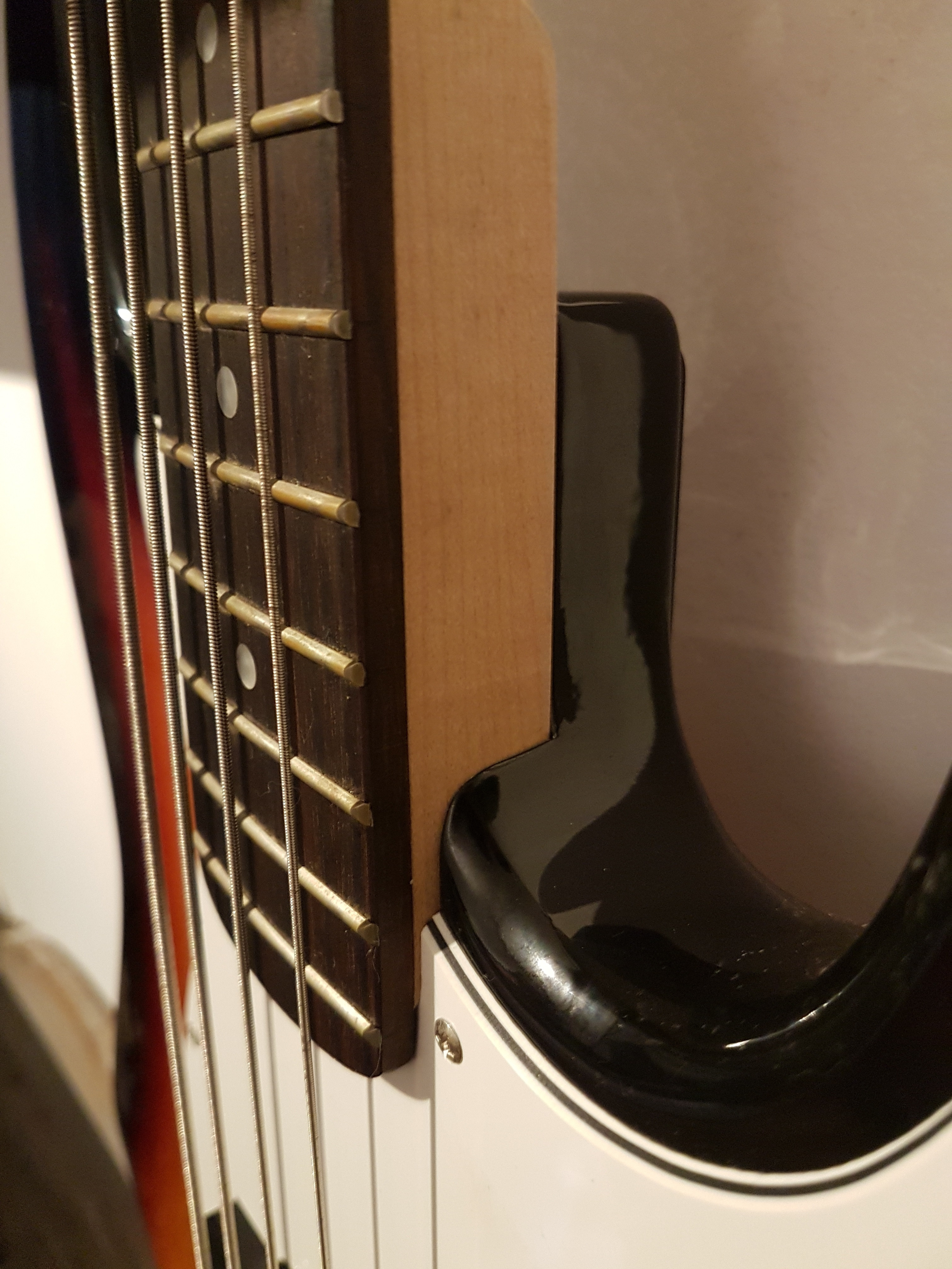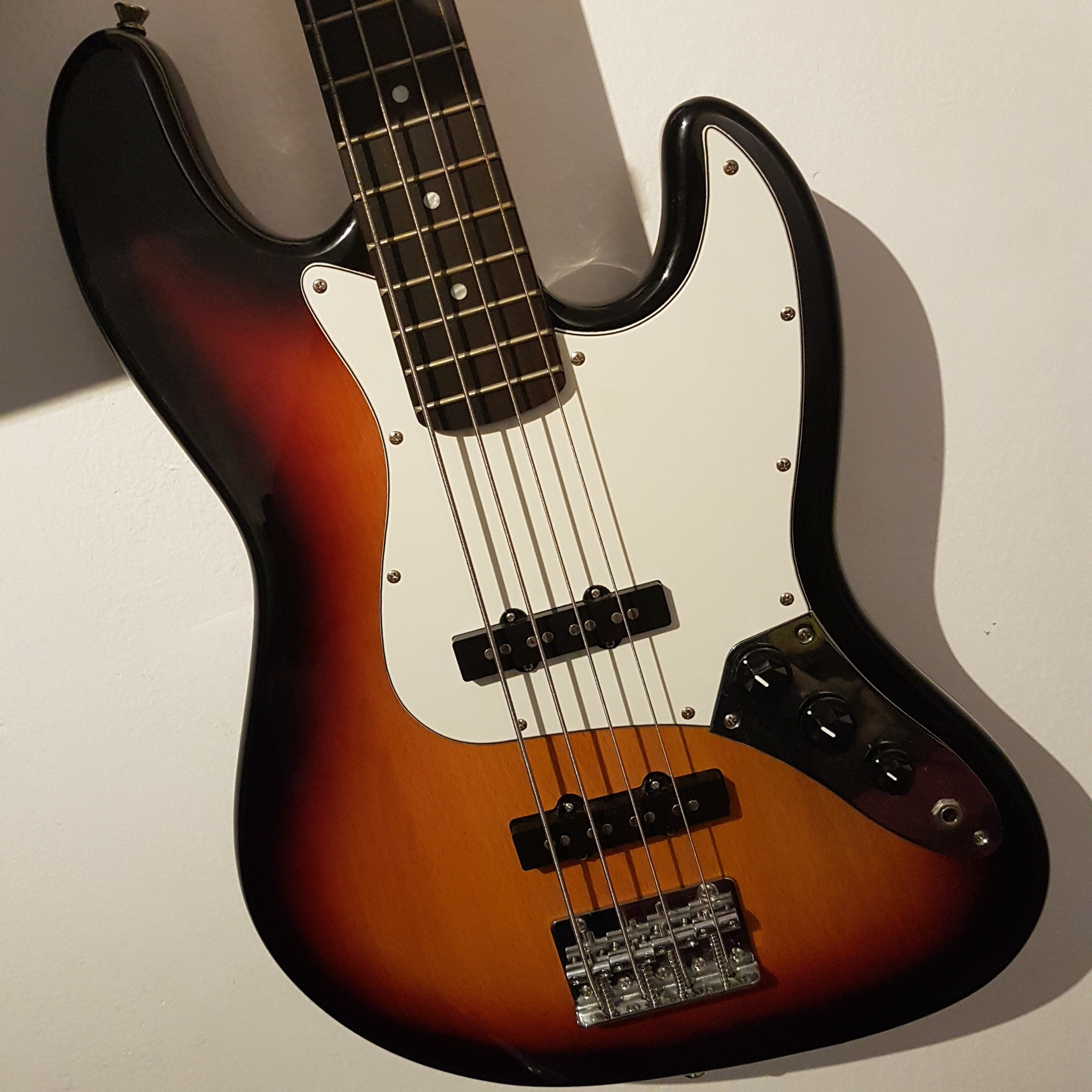 Bajo Memphis de 4 cuerdas, con cuerpo similar a un Stratocaster, y colores sunburn.